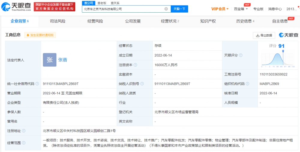 近日,北京车之京汽车科技有限公司成立,法定代表人为张蓓,注册资本1.6亿人民币,经营范围含汽车零配件批发、零售;物业管理;汽车零部件及配件制造;非居住房地产租赁等。股权穿透图显示,该公司由Leading Ideal HK Limited间接全资持股。