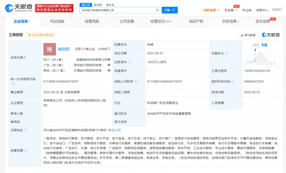 近日,沧州哈行网络科技有限公司成立,法定代表人为褚轶群,注册资本1500万人民币,经营范围包括物联网技术服务;共享自行车服务;普通机械设备安装服务;助动自行车、代步车及零配件销售;自行车及零配件零售等。股权穿透图显示,该公司由哈啰关联公司上海钧正网络科技有限公司全资控股。
